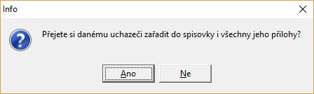 - po úspěšném založení spisu se program uživatele zeptá, jestli má do spisovky automaticky doplnit i případné nalezené přílohy. Při volbě "NE", je možno tak učinit dodatečně, viz. kapitola Dodatečné zařazení přílohy do spisu.