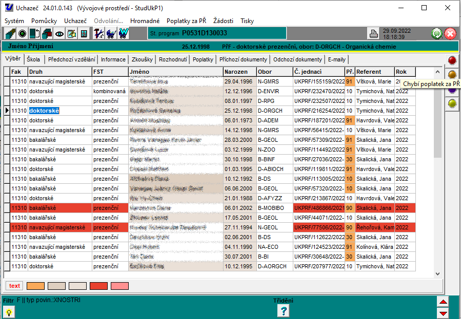 Pokud se takové přihlášky najdou, rozsvítí se signalizační panel v pravém horním rohu hlavní obrazovky. Podle čísla kontroly se rozsvítí příslušná barva. Kliknutím na kterékoliv aktivní barevné tlačítko na stavovém panelu (semaforu) v pravém horním rohu formuláře dojde k automatickému nastavení rychlého výběru. Při najetí myší na podbarvenou oblast se zobrazí plovoucí nápověda vysvětlující význam daného podbarvení.