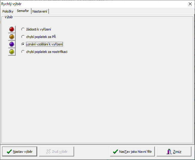 Uživatel tak bude upozorněn na to, že je třeba s těmito uchazeči provést žádoucí změny. Přihlášky, kterých se to týká, lze vyfiltrovat přes Rychlý filtr, kde vznikla nová záložka "Semafor". Zde jsou zpřístupněny filtry, u kterých kontrola našla nějaké uchazeče. S filtrem se pracuje stejně jako s ostatními filtry Rychlého výběru - zvolí se filtr a stiskne se tlačítko Nastav výběr. Filtr se zruší tlačítkem Zruš výběr.