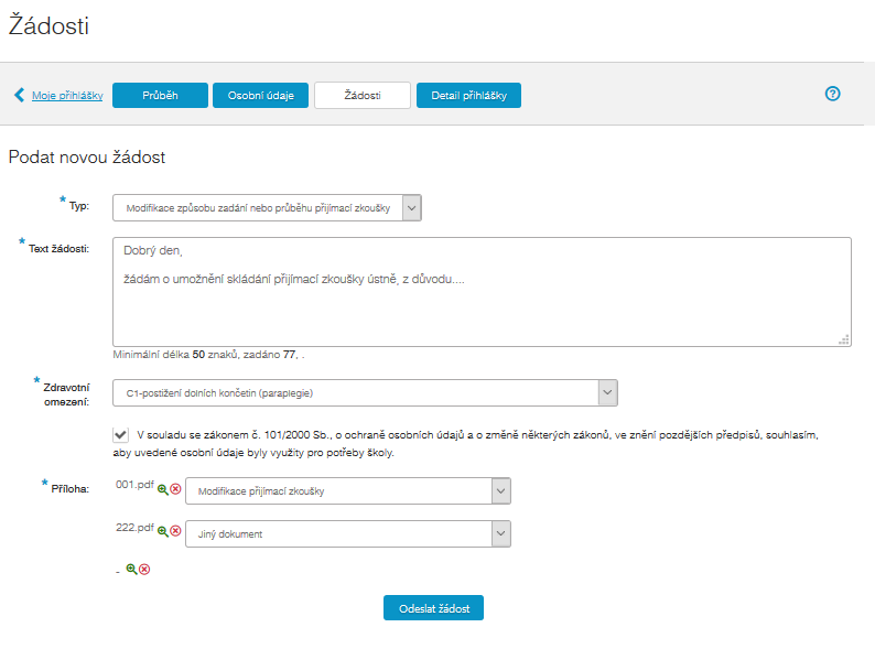 Žádost typu M - Modifikace způsobu zadání nebo průběhu přijímací zkoušky