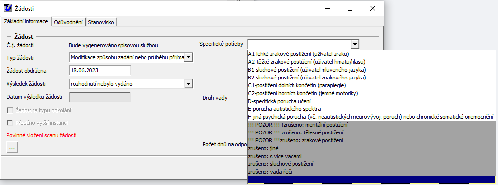 U žádosti typu "Modifikace způsobu zadání nebo průběhu přijímací zkoušky" (kód M z číselníku "Typ žádosti") se nabízí k vyplnění položka "Specifické potřeby".
