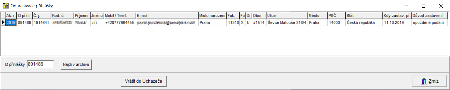 - Po stisku tlač. "Najdi v archivu" program přihlášku vyhledá a v tabulce zobrazí některé její položky.