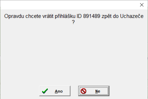 - Pokud se přihláška najde, lze ji odarchivovat tlačítkem "Vrátit do Uchazeče" a potvrzením hlášky: