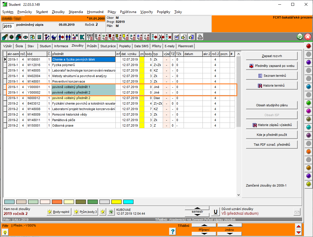Student » ZKOUŠKY » - zadáváním předmětů » Zakládání nových zkoušek jednotlivým studentům » Nové - povinné ze studijního plánu pro akt. ročník