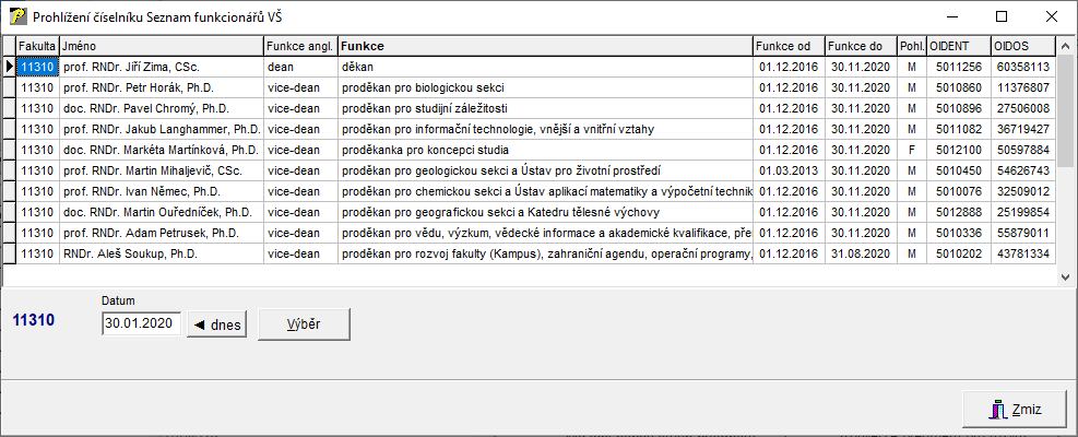 - Vložením data do položky "Datum" lze vyfiltrovat osoby jejichž funkční období spadá do zadaného data. Tlačítko "dnes" vloží do položky "Datum" aktuální datum.