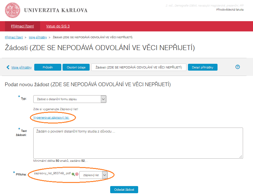 Nedílnou součástí podání žádosti je vytištění, podepsání (případná oprava předvyplněných údajů) a zpětné nahrání zápisového listu v žádosti formou povinné přílohy, proto se při podávání žádosti kontroluje, že uchazeč již má v přílohách "Zápisový list" vygenerován.