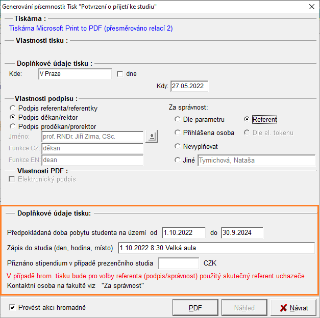 - V případě, že při hromadném generování bude u parametru "Za správnost" vybrána volba "Referent", použije se skutečný referent přihlášky