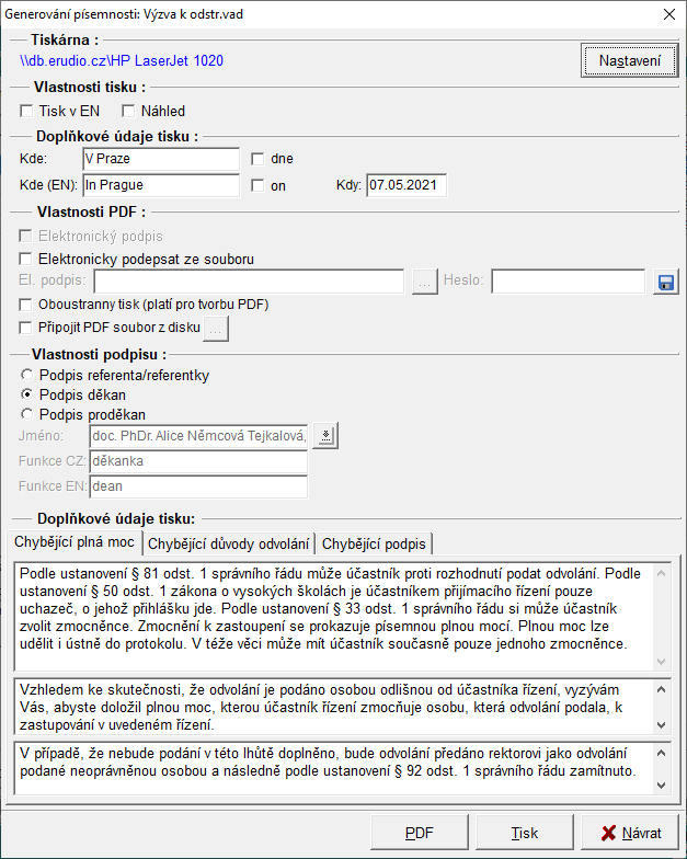 Poslední dvě vady je možno zaškrtnou jen při generování výzvy na fakultě. V rektorátní části zpracování odvolání jsou nepřístupné.