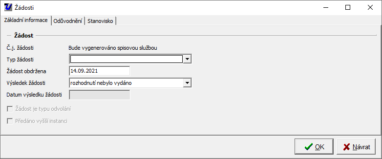V případě převzetí žádosti program otevře formulář pro novou žádost a před vyplní v něm datum přijetí podle data v podatelně. Je třeba zvolit "Typ žádosti".