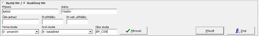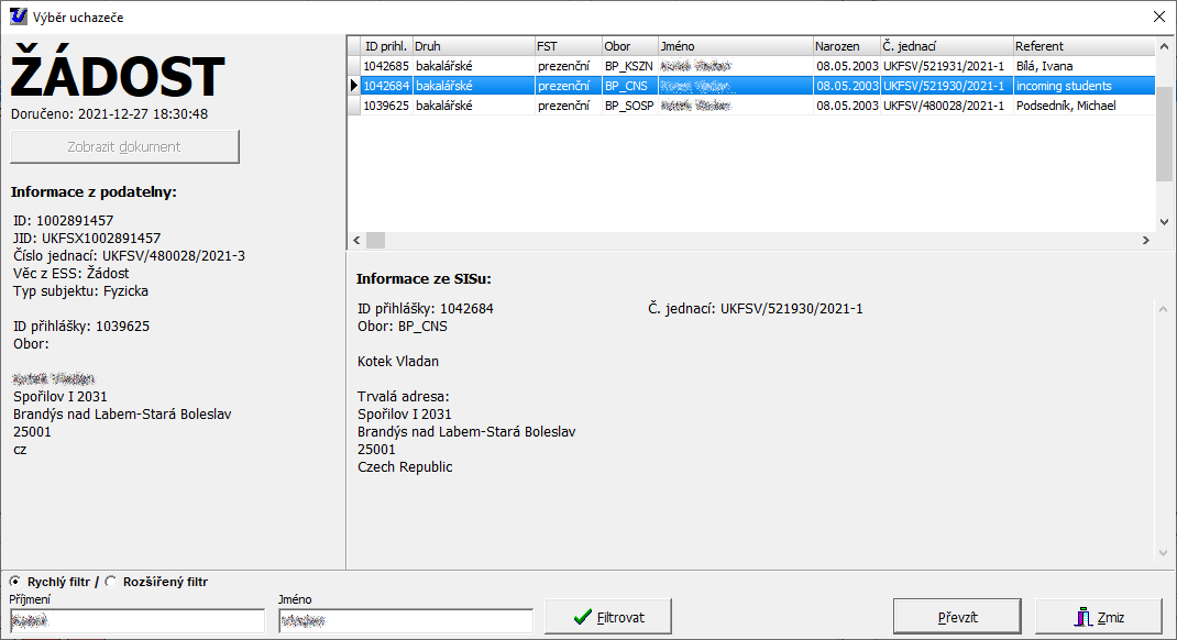 Pro případ chybně zadaného jména v podatelně je možno ručně zadat "Příjmení" + "jméno" a tlačítkem "Filtrovat" vyhledat správné přihlášky.
