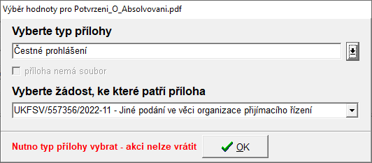 Při převzetí dokumentu typu příloha je nutno vybrat ze seznamu, o jaký typ přílohy se jedná, popřípadě jestli se jedná o přílohu k žádosti. Při nezvolení konkrétní žádosti se příloha přiřadí k přihlášce.