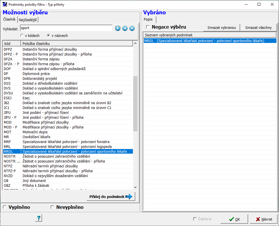 IS STUDIUM » Základní ovládání programu » Výběry a třídění » Příklady používání filtrů a třídění » Vyberte uchazeče, kteří nemají v přílohách potvrzení od sportovního lékaře.