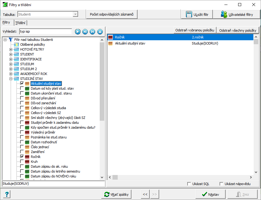 IS STUDIUM » Základní ovládání programu » Výběry a třídění » Příklady používání filtrů a třídění » Vyberte studenty ze 2. ročníku, kteří studují, a letošní zkoušky