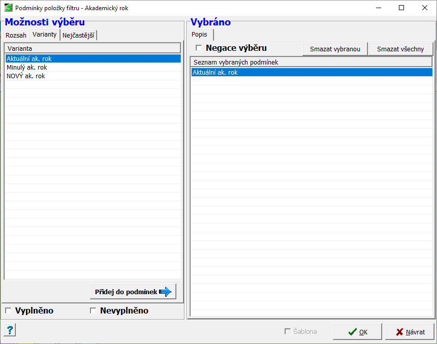 - dvakrát kliknete na položce Školní rok a vyberete variantu Aktuální školní rok. To je lepší, než zadat školní rok číslem pomocí rozsahu, protože aktuální rok je i v dalších letech platný