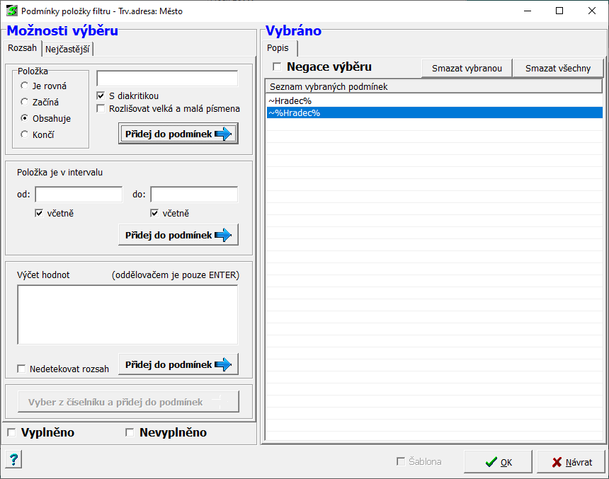 - zaškrtnete položku Obsahuje - tím vyberete města, jejichž název obsahuje text Hradec (např. Jindřichův Hradec, Hradec Králové)