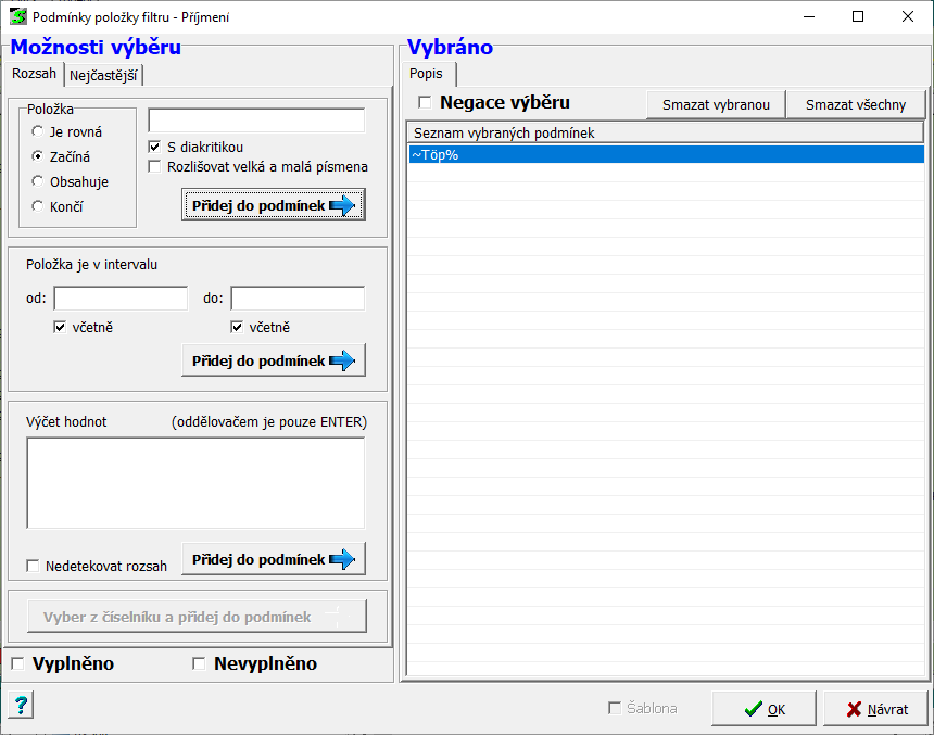 - zobrazí se okno pro specifikaci rozsahu, do pole doplníte text Töp a zaškrtnete možnost "Začíná"
