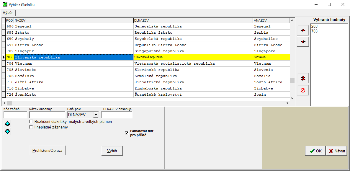 - v otevřeném číselníku dvojitým kliknutím označíte Českou republiku a Slovenskou republiku - viz obrázek s již vybranými státy
