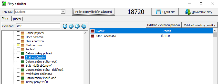 - chcete-li nyní spočítat pouze počet studentů v 1.ročníku bez ohledu na státní příslušnost, odškrtnout položku "Stát občanství" v levé části okna, nebo na ni najet v pravé části a kliknout na tlačítko Odstraň vybranou položku. Kliknutím na tlačítko Počet odpovídajících záznamů zjistíte příslušný počet,