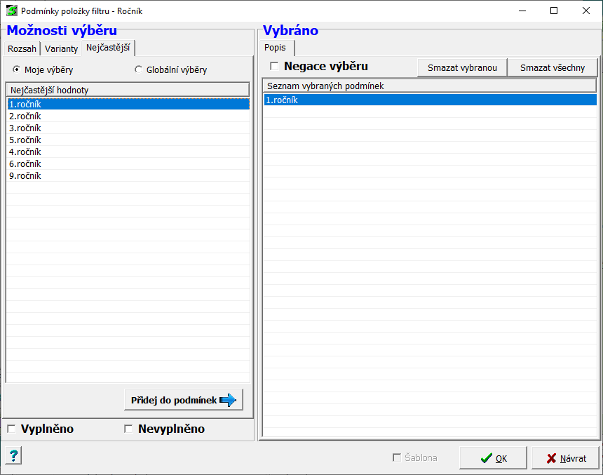 - pomocí pole "Vyhledat" najdete řádek ročník a dvojitým kliknutím aktivujete okno pro specifikaci podmínky - viz obrázek