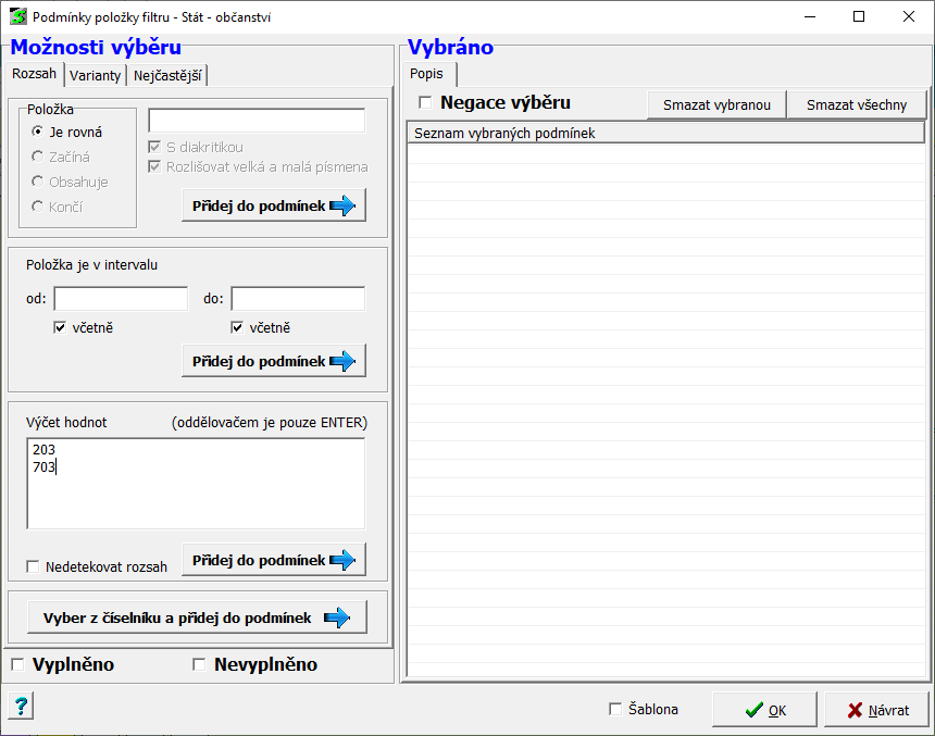 - výběr můžete rovněž provést z číselníku - kliknutím na Veber z číselníku a přidej do podmínek