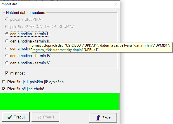 Volba Přerušit, jeli položka již vyplněná - pokud není zaškrtnutá, již vyplněné údaje se při importu přepíší.