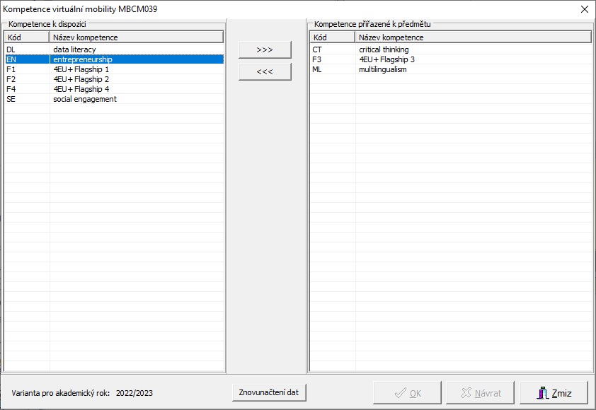 - Vybírá se z celouniverzitního číselníku "Kompetence virtuální mobility".