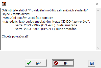 - Pokud je některá z výše uvedených položek vyplněná, program na tuto skutečnost při ukládání změn upozorní, vypíše seznam položek, které budou mazány a zeptá se uživatele, zda má pokračovat. Uživatel může ukládání/smazání přerušit.