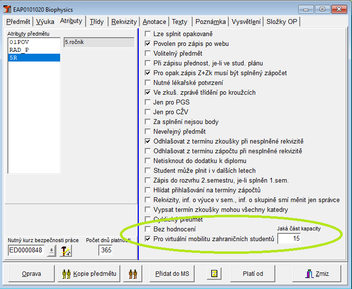 Tajemník » Úvod k programu Tajemník » Předměty » Prohlížení - oprava předmětu » Předmět » Záložka Atributy » Pro virtuální mobilitu zahraničních studentů