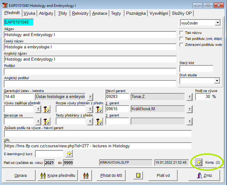 - Způsob přiřazování kompetencí VM k předmětu je podobný jako přiřazování alternativních jazyků výuky (záložka Výuka).