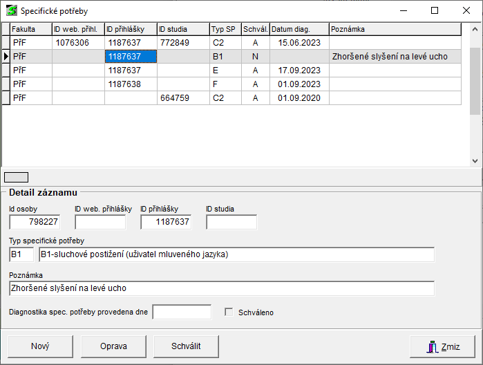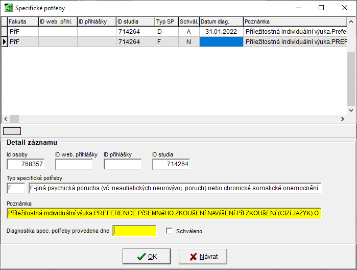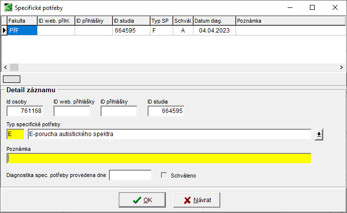- ID studia - pokud je vyplněno jen ID studia a nevyplněno ID přihlášky, specifickou potřebu zaevidovala referentka v programu Student