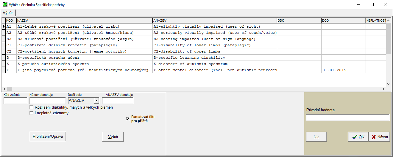 - Typ SP - kód Specifické potřeby z číselníku "Zdravotní znevýhodnění