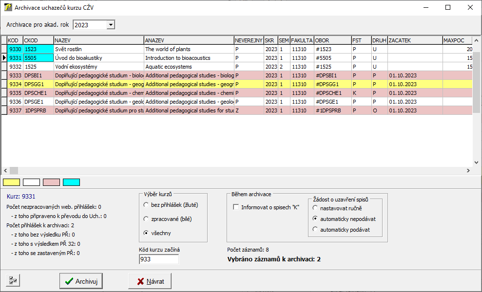 V okně "Archivace uchazečů kurzu CŽV" se zobrazí tabulka, ve které jsou všechny kurzy dané fakulty a vybraného akad. roku.