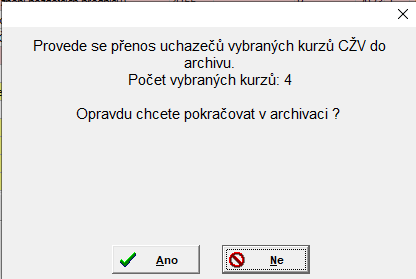 - Po výběru kurzu/ů k archivaci a stisku tlačítka "Archivuj" program zobrazí počet kurzů, které se budou archivovat a zeptá se, zda má pokračovat.