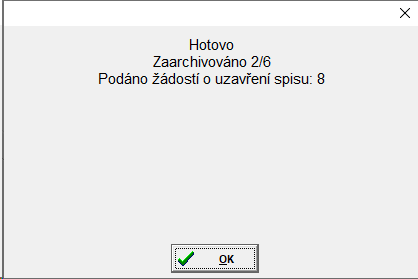 - Po skončení archivace program zobrazí společně s počtem zaarchivovaných kurzů také celkový počet podaných žádostí o uzavření spisu.