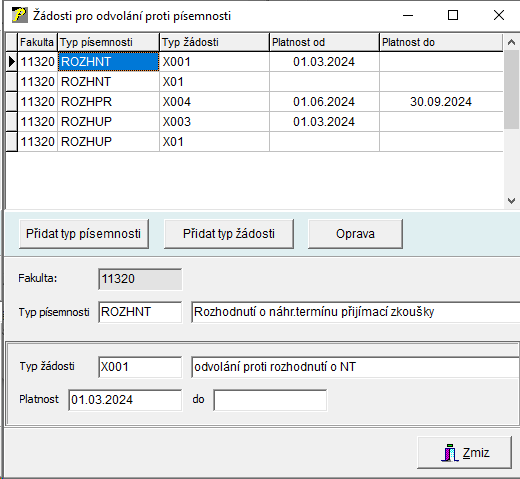 * Při vkládání nových záznamů (ručním zadáním kódu) se kontroluje existence kódu v číselníku, možnost použít pro odvolání, jedinečnost záznamu pro stejnou fakultu, písemnost a žádost.