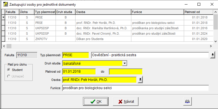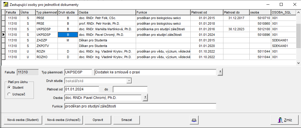 Zde lze pro jednotlivé typy dokumentů a druhy studia nastavit, jaká zastupující osoba se má na dokumentu uvádět.