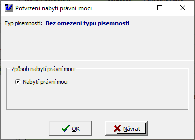 - způsob nabytí právní moci při hromadném potvrzení = "Nabytí právní moci" dle předpokládaného data (dle nastavení v číselníku "Typy písemností" u jednotlivých písemností)