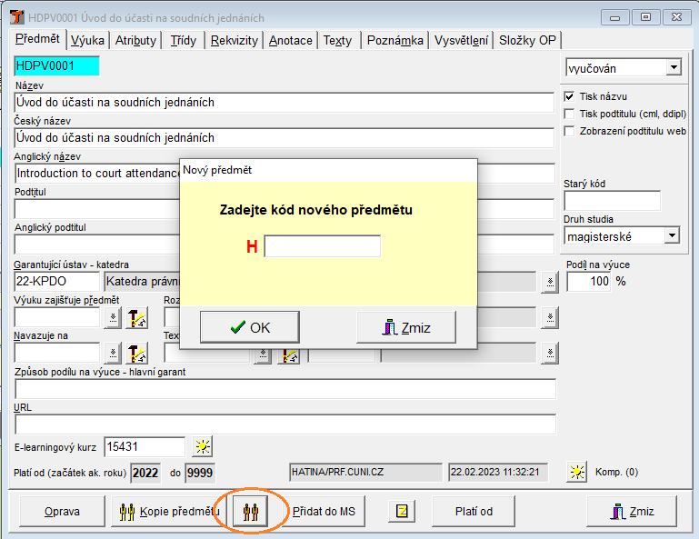 Po stisknutí tlačítka zadá uživatel nový kód předmětu. Založí se nový předmět kopií, stejně jako se dělá Kopie předmětu dosud.