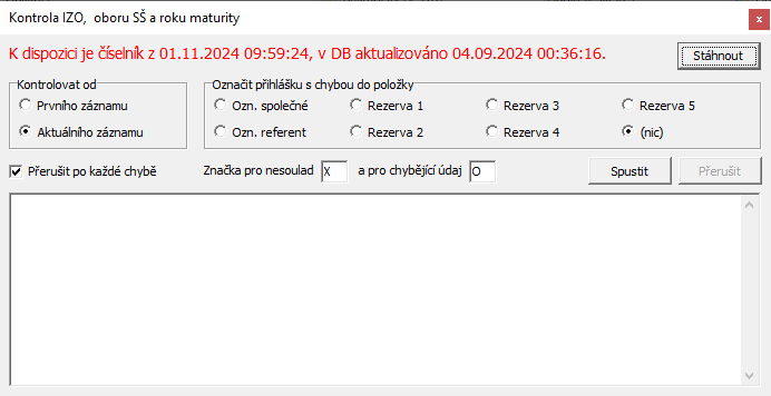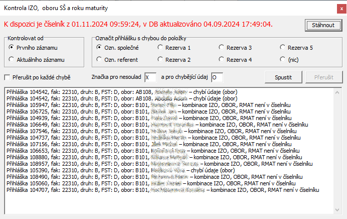 - v okně "Kontrola IZO, oboru SŠ a roku maturity" se dá spustit kontrola s tím, že problematické přihlášky se označí do vybraného pomocného údaje, podle nějž se pak dá filtrovat (Označení společné, Označení referent, Rezerva...)
