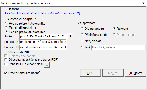 1. Generování písemnosti je přístupné v menu Uchazeč/Písemnosti/Nabídka na změnu formy studia. Otevře se dialogové okno tisku, kde je možno nastavit osobu pro podpis, za správnost, vlastnosti PDF.