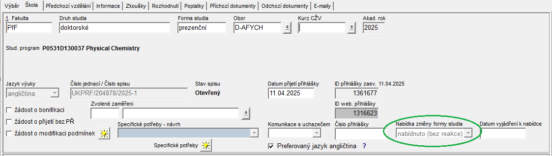Uchazeči doktorského studia, který si podal přihlášku na studijním programu v prezenční/kombinované formě studia, ke kterému je souběžně otevíraný i stejný studijní program v kombinované/prezenční formě studia, může být kdykoliv před vypravením rozhodnutí o ne/přijetí vygenerován dokument „Nabídka na změnu formy studia (NABFOST)“ u jím podané přihlášky.