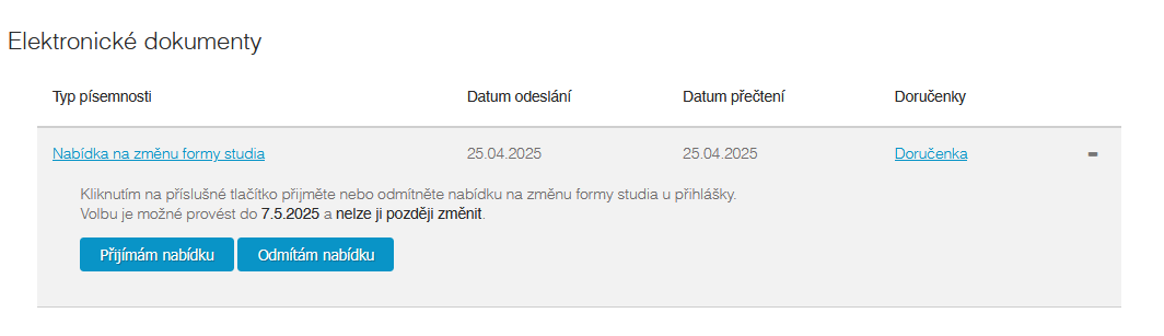 2. Písemnost bude zobrazena u podané přihlášky v modulu Přijímačky (sekce „Elektronické dokumenty“). Přijetí nabídky bude uchazeči v modulu zprostředkováno pomocí tlačítka opatřeného potvrzovacím dotazem, dostupného přímo v rozevíracím detailu přijaté/doručené písemnosti daného typu s oznámením nabídky, a to až do konce trvání lhůty, nebo do přijetí nabídky. Poté už nebude mít možnost svou volbu upravit.