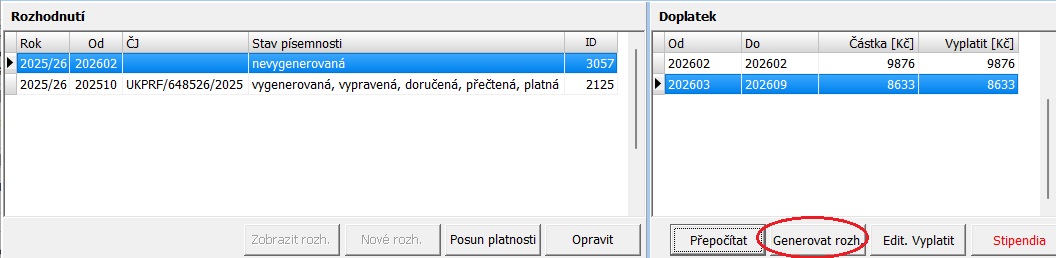Po přepočtu doplatku je možno vygenerovat "Rozhodnutí o přiznání stipendia dle Čl. 12 (doktorandské stipendium)" (kód ROZS12)".