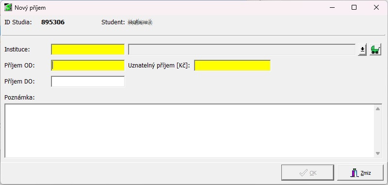 - Nový příjem - lze přidat ručně i u studia u kterého nemá student podanou žádost o přiznání stipendia (viz Žádosti), jen bez podané žádosti není možno generovat rozhodnutí a není možné ani počítat v daném roce výši stipendia.