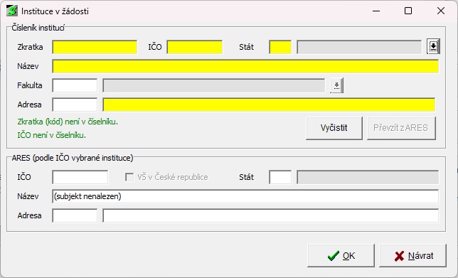 otevře se formulář, kde lze instituci zadat ručně, případně dohledat v databázi ARES