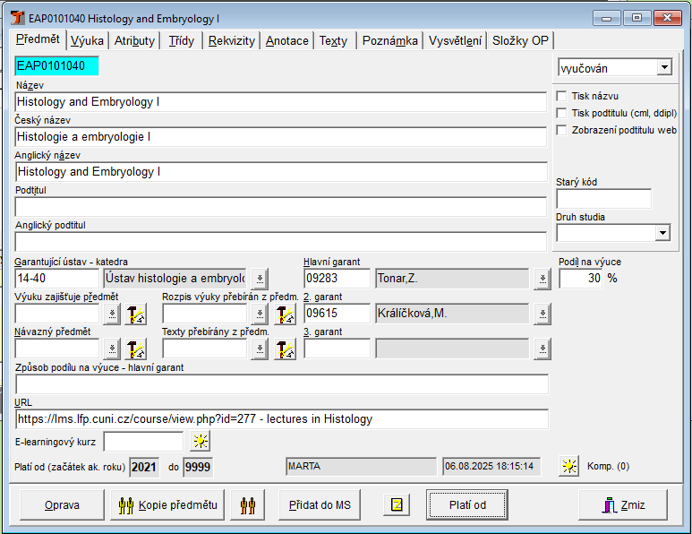 Okno vybraného předmětu nám umožňuje prohlížet a po stisknutí tlačítka Oprava i měnit parametry vybraného předmětu. V názvu okna je kód a název předmětu.