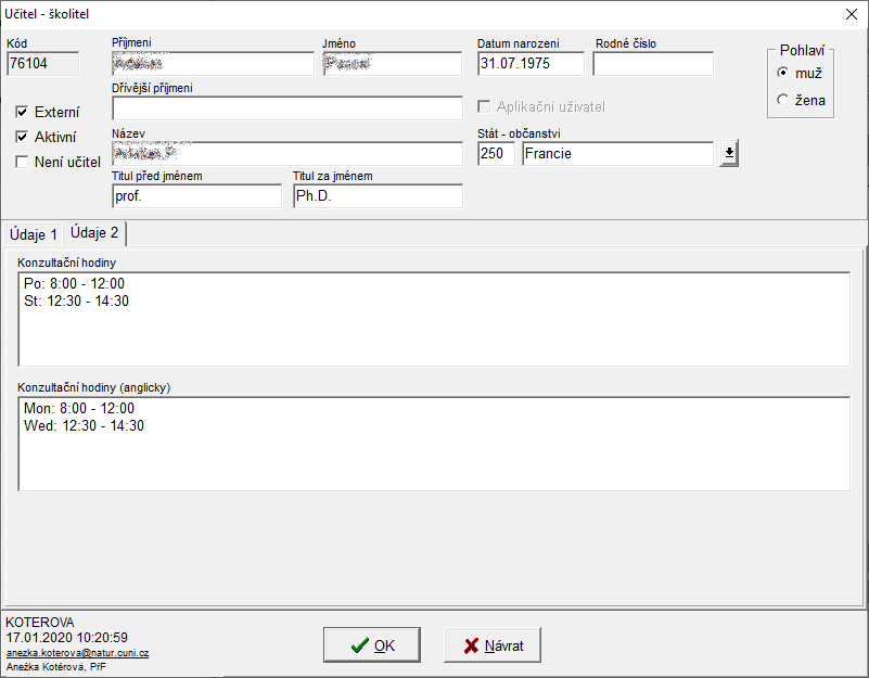 Všechny položky na panelu, kde se nachází fakulta, se vztahují k učiteli na dané fakultě. Ostatní údaje jsou osobní, tj. jsou společné pro všechny učitelské účty této osoby na různých fakultách. Správný stav je takový, že osobní údaje jsou evidovány pouze jednou, ale různých kódů učitele má osoba tolik, na kolika fakultách učí.