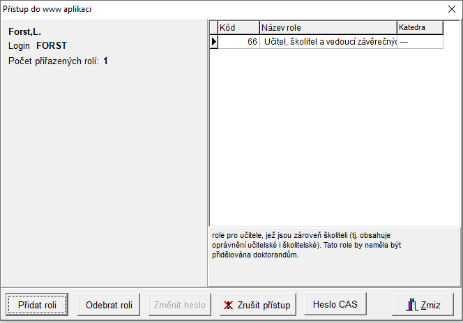 - zrušit přístup - POZOR! tímto příkazem odeberete vyučujícímu všechny role na fakultě, za kterou pracujete, a zrušíte mu heslo!