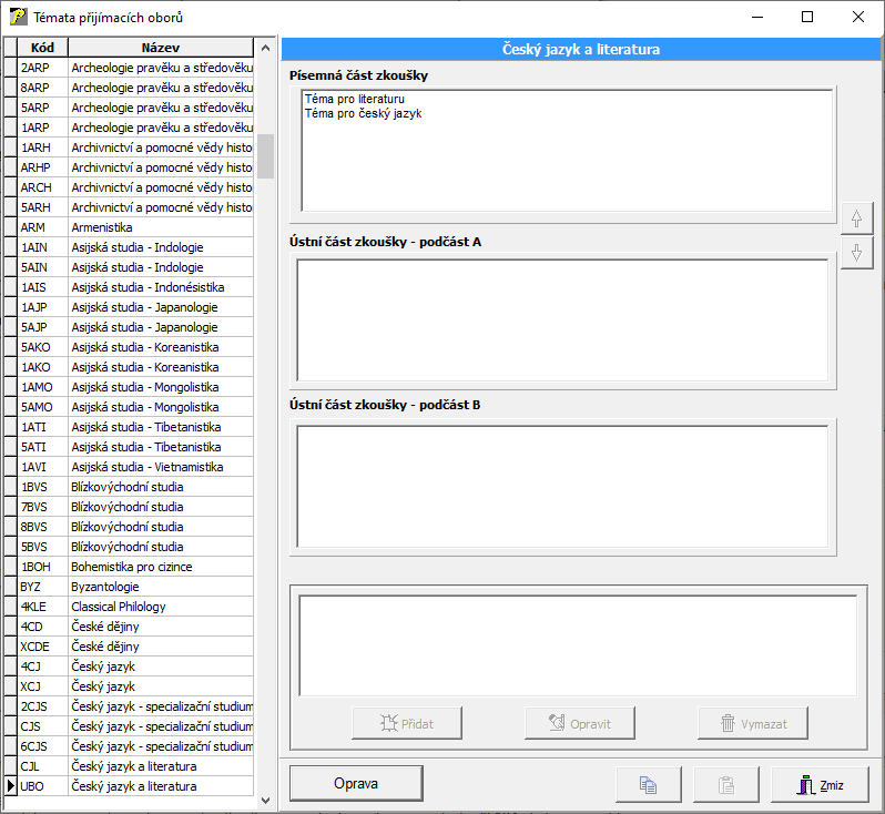 - Po vybrání oboru z levé části okna a stisku tlačítka Oprava se zpřístupní pravá část okna.