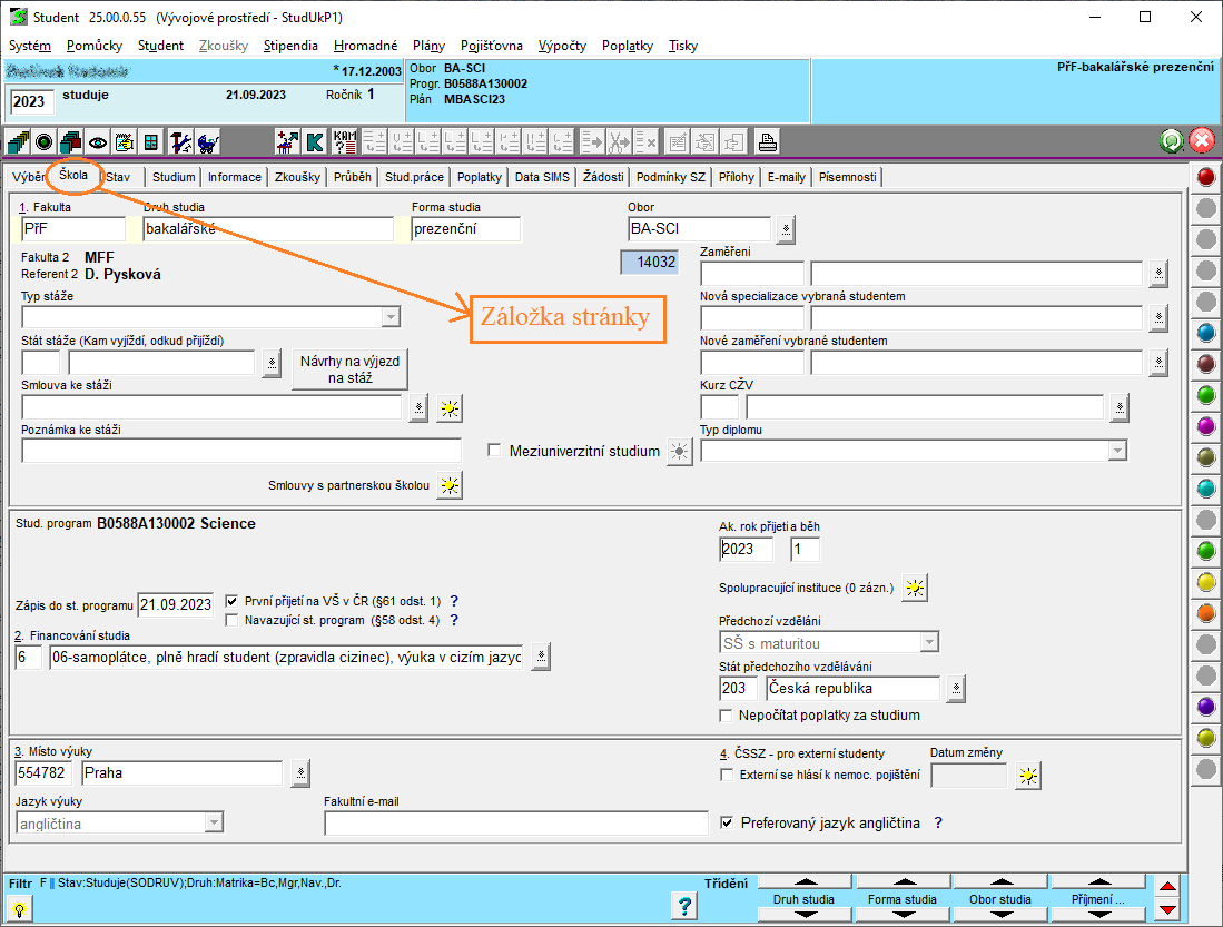 Všimněte si, že karta jednoho studenta má několik stránek (záložky v horní části formuláře) - stránku Škola, Stav, Studium, Informace, Zkoušky, Průběh, Stud. práce. Referentce stačí kliknout na záložku stránky a vidí potřebné údaje - např. průběh studia nebo studium (obrázky těchto stránek jsou uvedeny dále).